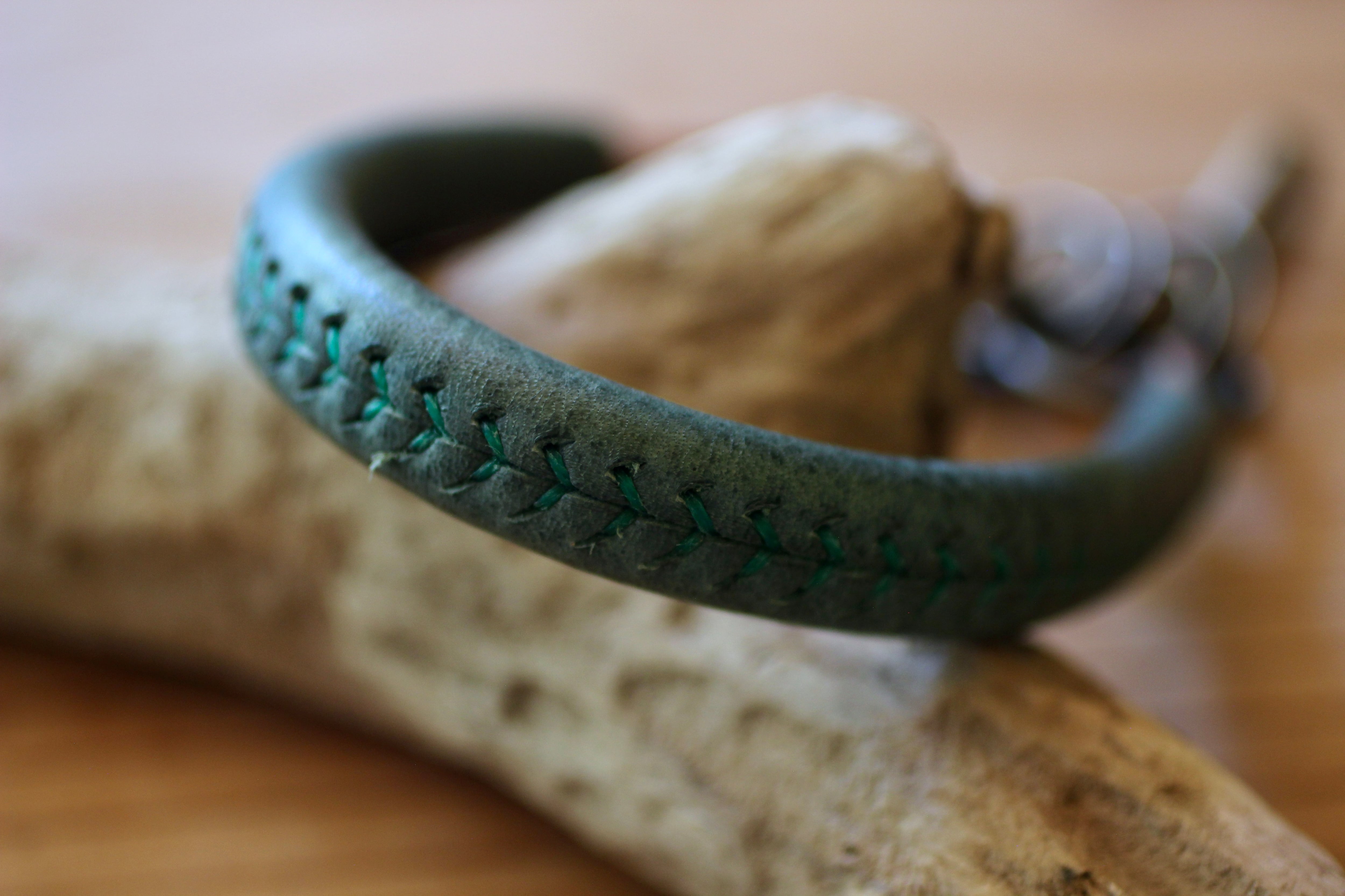 ハードなヌメ革に、ソフトなイタリアンレザーを巻き付け、手縫いで仕上げています。