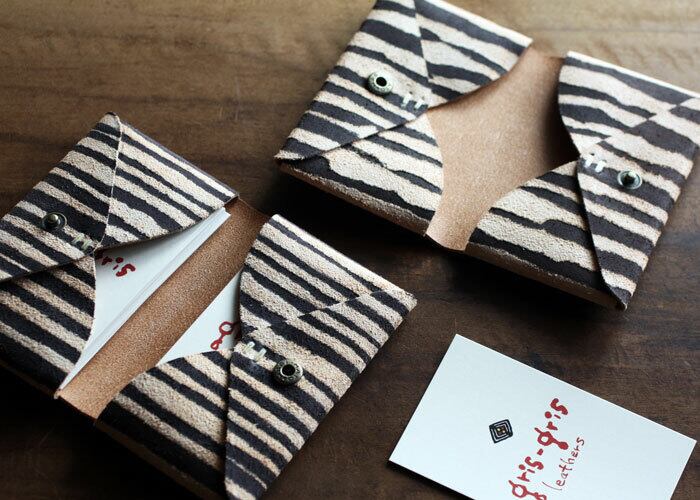 これは世にも珍しいシマウマの革、、ではなく、マスキングテープを使い、型染めのような技法でシマウマ柄に染めた牛革です。