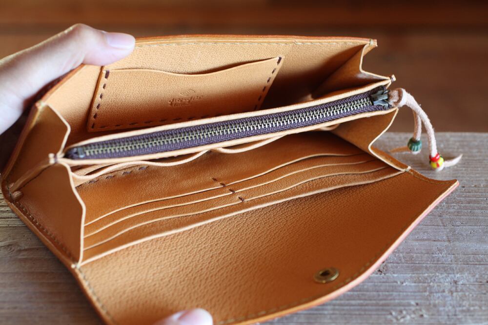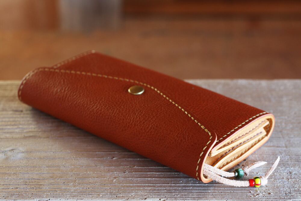 麻糸に強度を上げる為ロウを塗り込み、丁寧に手縫いしています。