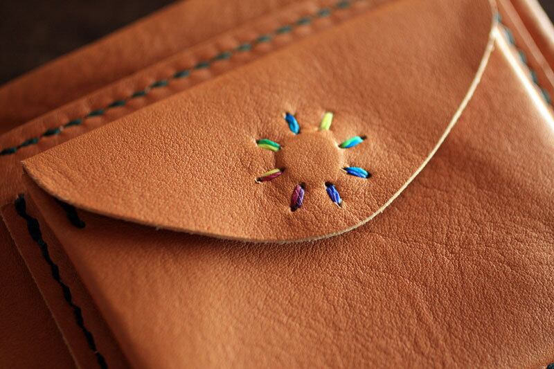 麻糸に強度を上げる為ロウを塗り込み、丁寧に手縫いしています。