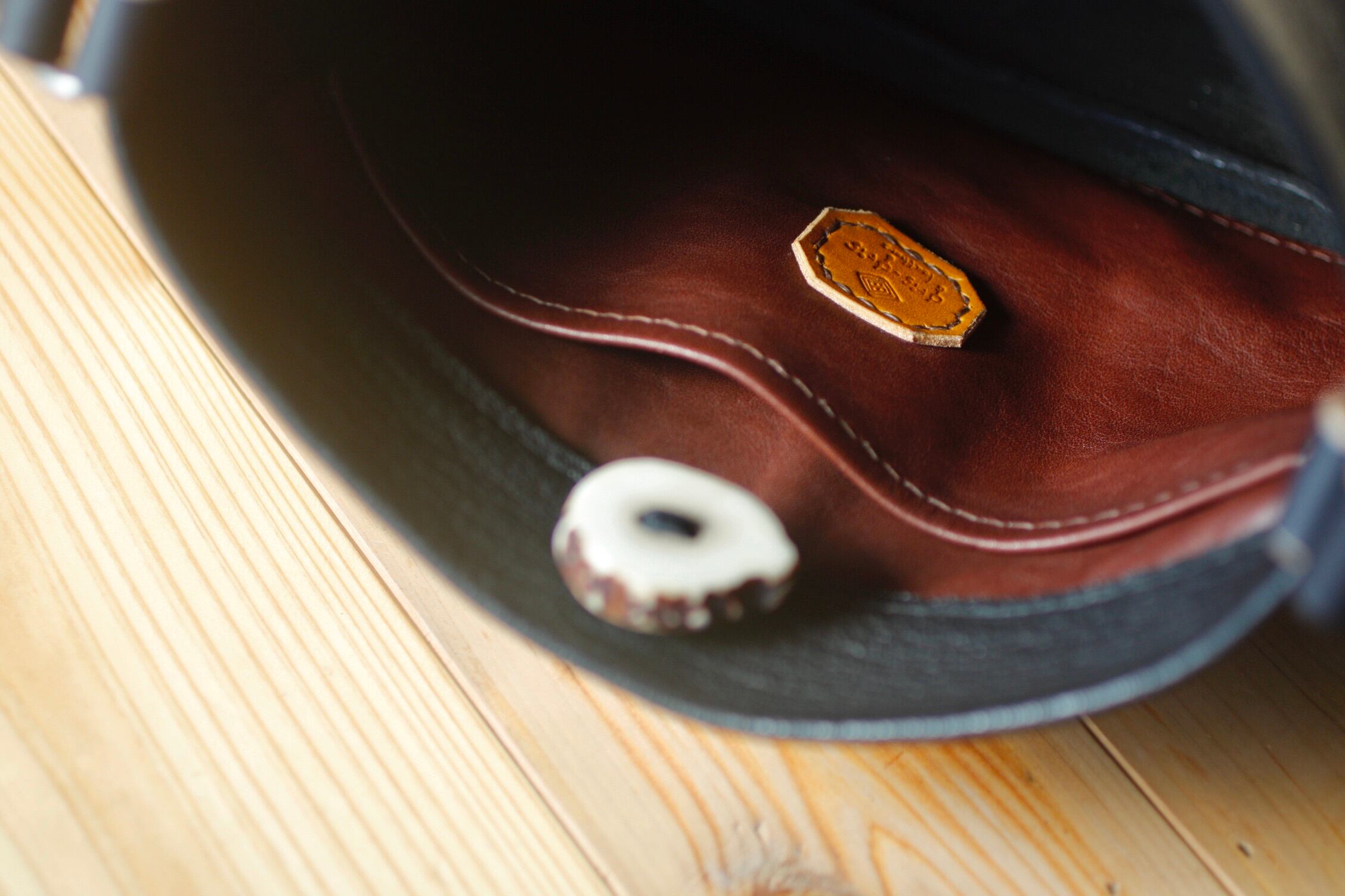 山で拾った鹿の角でボタンをつくり、バッグにつけました。